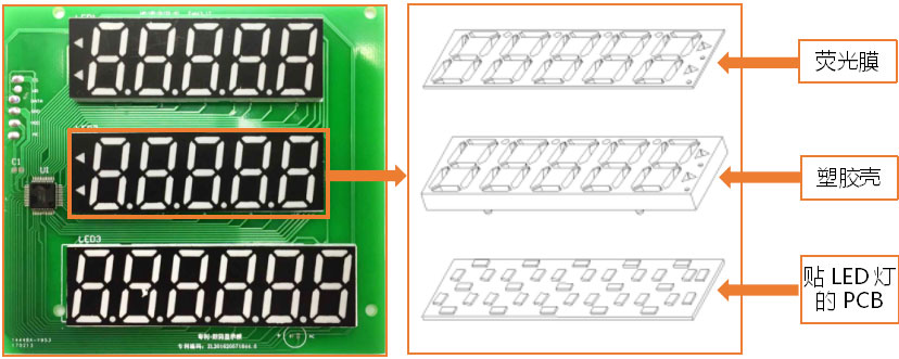 如上圖所示,左邊為實際生產(chǎn)出來的顯示板,右邊為顯示板5位數(shù)碼顯示內(nèi)部結(jié)構(gòu)。貼片發(fā)光二極管作為顯示發(fā)光體,與塑料殼和熒光膜組成一個5位一體數(shù)碼管。貼片二極管采用我們的專利發(fā)光二極管,以配合我們的驅(qū)動IC實現(xiàn)單面板走線。若有某段位的燈壞了,我們只需要把殼子取下來,換掉那個燈,即可修好。