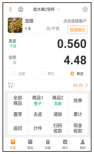 ◆ 手機(jī)收銀:計(jì)價(jià)秤通過藍(lán)牙把稱重重量信息發(fā)送到手機(jī)APP,在手機(jī)APP稱重界面,可從快捷列表中快速選擇商品進(jìn)行收銀操作,全程無需在秤上使用按鍵操作。