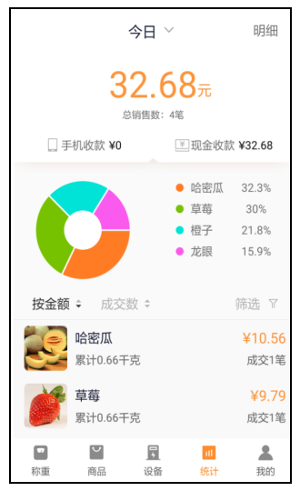 ◆ 銷售數(shù)據(jù)統(tǒng)計(jì):無論是在手機(jī)端收銀,還是在秤端收銀,都可以統(tǒng)計(jì)銷售情況,并將數(shù)據(jù)保存在云端,隨時(shí)隨地可以查看。