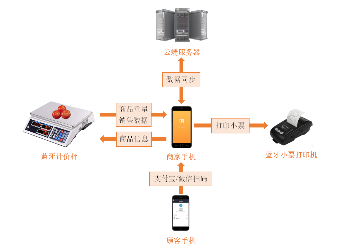 該方案使用藍(lán)牙連接方式,以手機(jī)作為平臺(tái),利用芯易德開發(fā)的“銀秤通”APP將商用秤連接到互聯(lián)網(wǎng),實(shí)現(xiàn)移動(dòng)支付收款、商品管理、銷售數(shù)據(jù)統(tǒng)計(jì)、小票打印等功能。