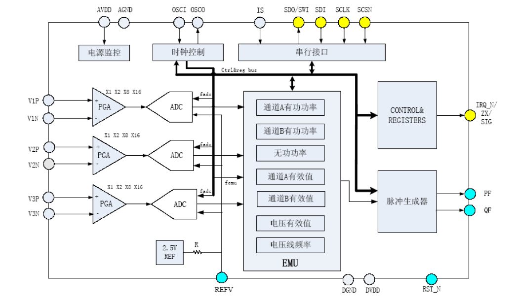 ◆ 提供兩路電流和一路電壓有效值測量,在400:1 動態(tài)范圍內(nèi),有效值誤差<0.5%
